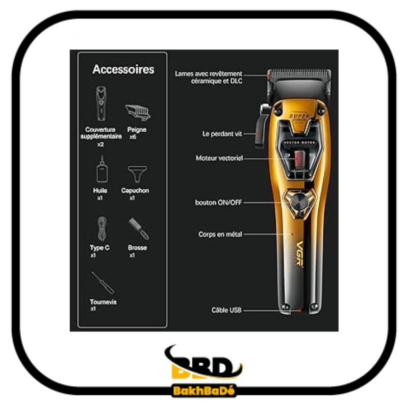 Kit complet avec 6 peignes guides réglables : Ce kit de toilettage comprend une tondeuse cheveux pro et 6 sabots robustes (1,5 à 12 mm) pour des coupes personnalisées, du style court au look plus long. Idéal pour réaliser un tondeuse dégradé précis à la maison ou en salon. Il inclut aussi 2 coques colorées, un câble USB, de l’huile pour lames, une brosse, un tournevis, un protège-lame et un coffret de rangement pratique. Des résultats nets à domicile comme en salon